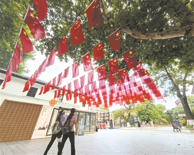 为迎接国庆、中秋“双节”到来,西津渡文旅公司连日来在街区主要景点、沿街商铺等地悬挂五星红旗,营造浓厚的节日氛围。文雯 摄